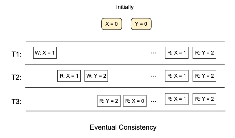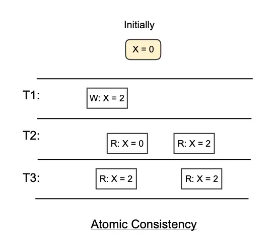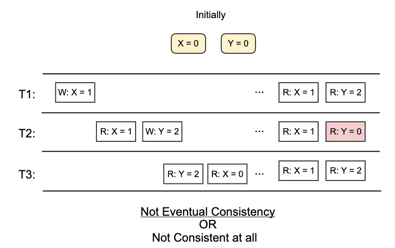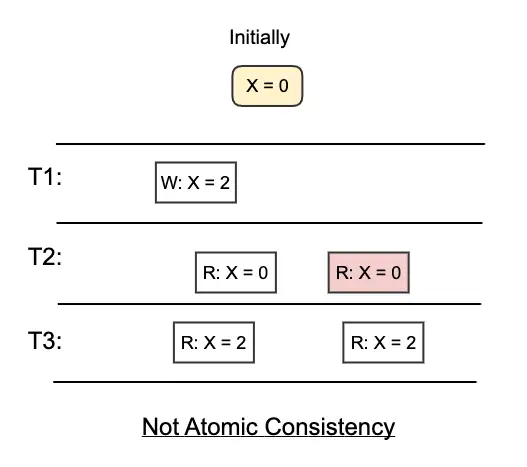 - e.g. Let X=0 initially. After a write operation to set X=1, the read operation may still get X=0