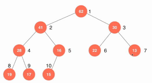 常以树状数组存储,若数组索引以1开始,则对应要求可以书写为 a[i] >= a[i * 2], a[i] >= a[i*2]。如下图: