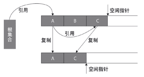 拿空间换时间,将内存按容量分为大小相等的两块,每次只使用其中的一块(对象面),当这一块的内存用完了,就将还存活着的对象复制到另外一块内存上面(空闲面)。