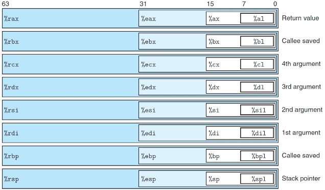 - %rax, %rcx, %rdx, %rbx, %rsi, %rdi, %rsp, %rbp