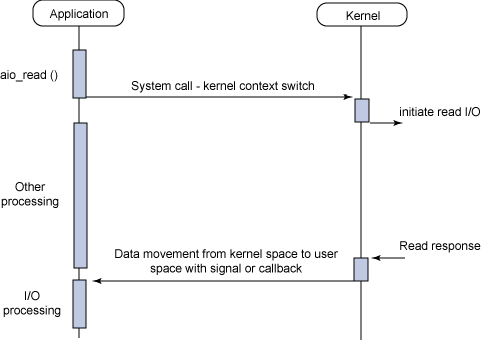 The read request returns immediately, indicating that the read was successfully initiated. The application can then perform other processing while the background read operation completes. When the read response arrives, a signal or a thread-based callback can be generated to complete the I/O transaction.